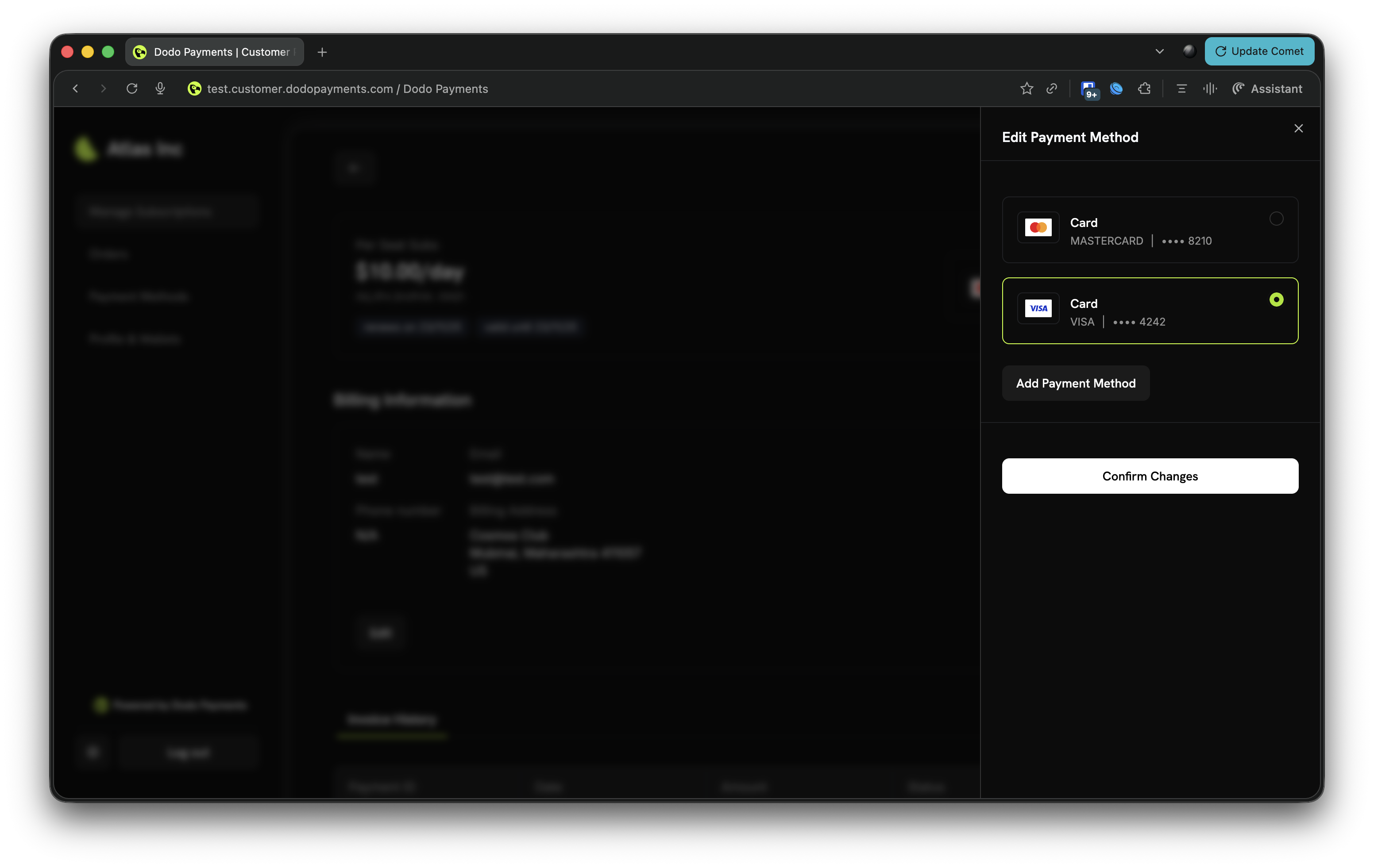 When customers click “Edit” on the payment method section, they can:- Select an existing payment method: Choose from previously saved payment methods